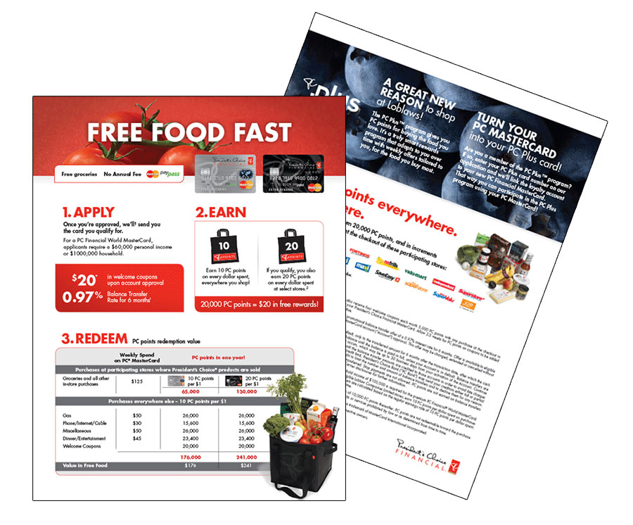 PC Financial needed an uptake in acquisition and to bring the PC MasterCard to front-of-wallet. Born from the insight that people innately love free stuff, my writing partner, Diane Trojan, came up with the line FREE FOOD FAST. It was clear these three words were going to hit home.